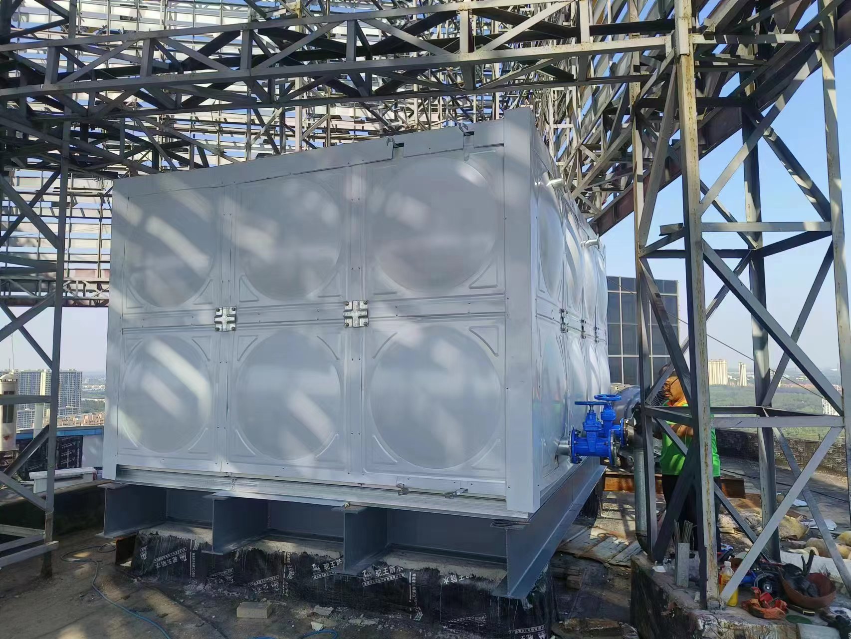玻璃鋼聚氨酯彩鋼板保溫水箱現(xiàn)場(chǎng)圖:客戶根據(jù)自己實(shí)際要求設(shè)置的條形基礎(chǔ),安裝工人到達(dá)現(xiàn)場(chǎng)就可以直接焊接槽鋼底座,不耽誤工期。騰翔公司具有專業(yè)的安裝團(tuán)隊(duì),保障了安裝水箱的質(zhì)量和效率。玻璃鋼聚氨酯彩鋼板保溫水箱是適合用在室內(nèi)的保溫水箱,保溫效果好,價(jià)格適中。